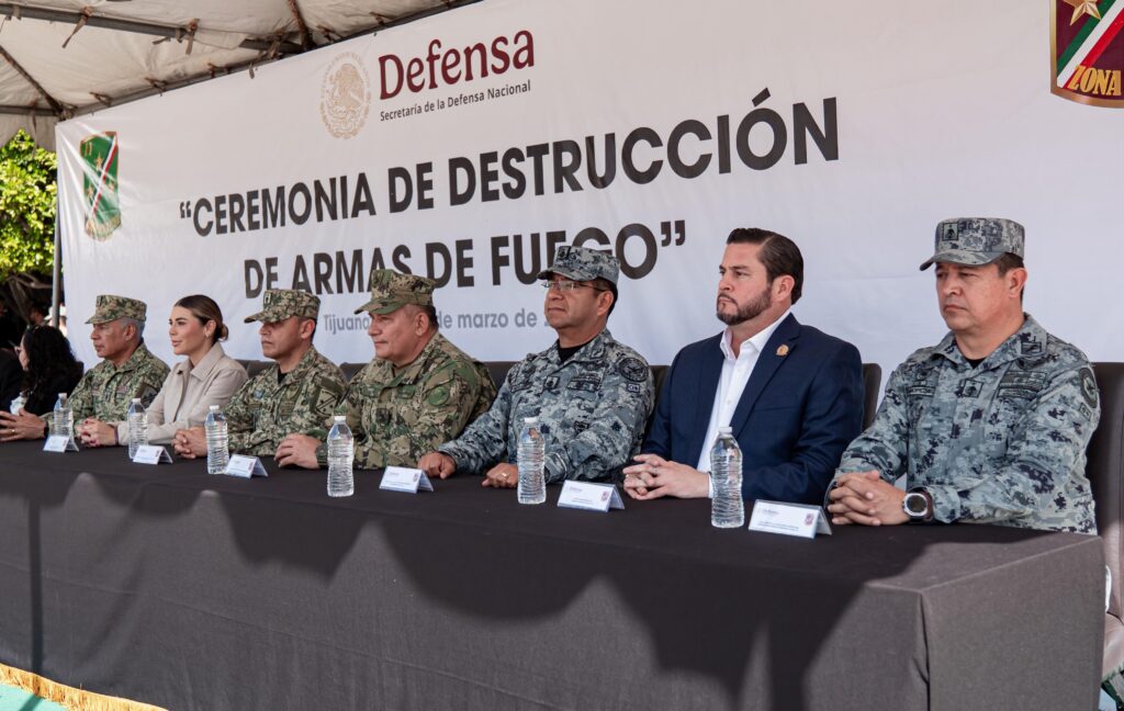 Tijuana, Baja California, a 17 de marzo de 2026. El presidente municipal, Ismael Burgueño Ruiz, asistió este martes a la ceremonia de destrucción de armas de fuego, encabezada por la gobernadora del estado, Marina del Pilar Avila Olmeda, y llevada a cabo en las instalaciones del Cuartel General de la Segunda Zona Militar, ubicado en la colonia Morelos.