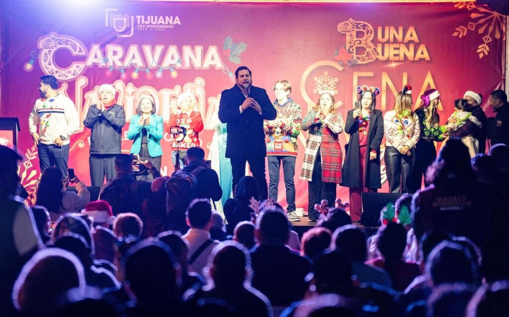 Tijuana, Baja California, a 20 de diciembre de 2025. Más de 5 mil tijuanenses presenciaron el paso de la Caravana Navideña, encabezada por el presidente municipal, Ismael Burgueño Ruiz, que dio inicio alrededor de las 17:00 horas desde la estación Insurgentes del SITT, como parte de las celebraciones organizadas por el Gobierno Municipal, para llevar un mensaje de unidad y espíritu festivo a las familias durante esta época del año.