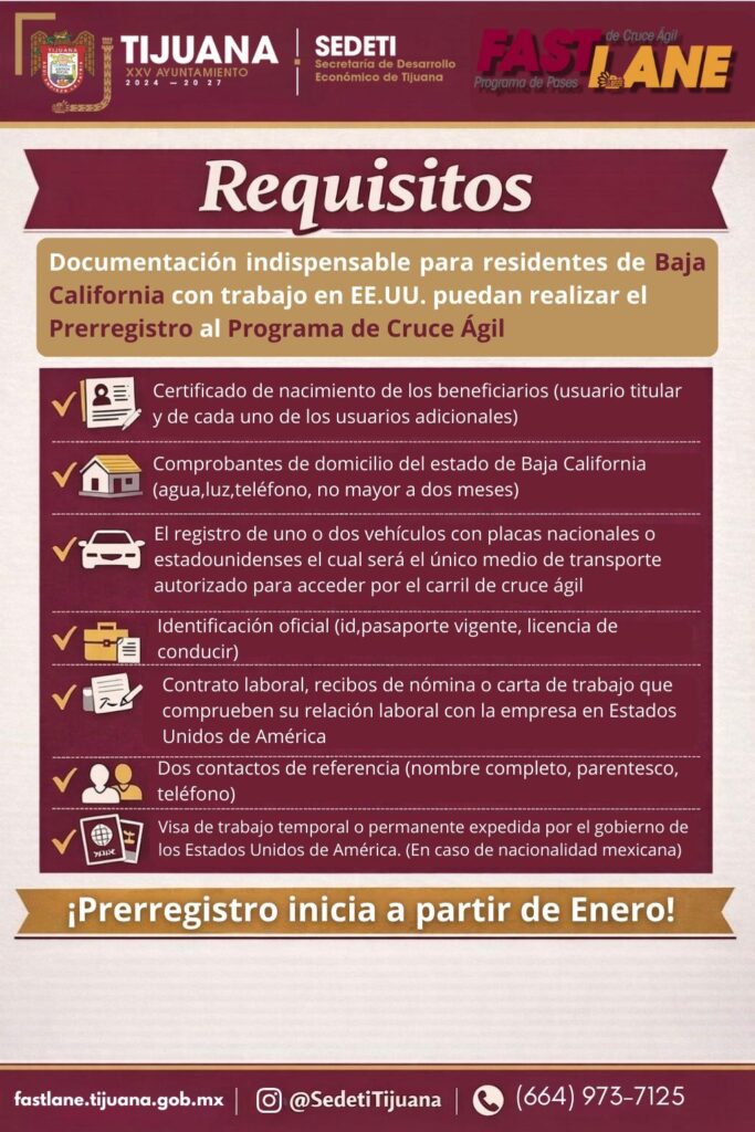 Tijuana, Baja California, a 11 de enero de 2026. El gobierno del presidente municipal, Ismael Burgueño Ruiz, a través de la Secretaría de Desarrollo Económico de Tijuana (SEDETI), informa que se encuentra disponible el prerregistro del Programa de Cruce Ágil para Trabajadores Transfronterizos, una iniciativa diseñada para mejorar la movilidad y la calidad de vida de las y los tijuanenses que laboran en los Estados Unidos.
