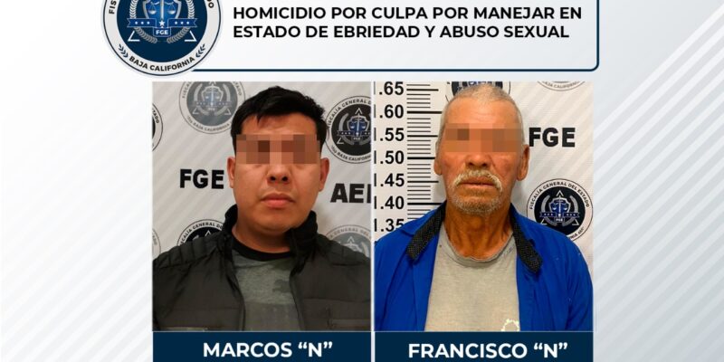 TIJUANA, BC, 10 DE ENERO DE 2023.- Labor de gabinete y campo efectuada por agentes de la Fiscalía General del Estado, derivó en la aprehensión de dos hombres que, en casos distintos, son señalados de los delitos de homicidio por culpa por manejar en estado de ebriedad y abuso sexual.