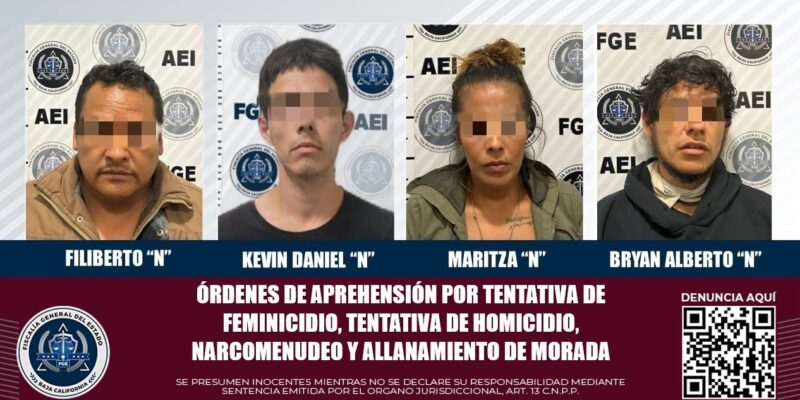 TIJUANA, BC, 07 DE OCTUBRE DE 2023.- Agentes estatales de investigación, de la Fiscalía General de Baja California, cumplimentaron cuatro órdenes de aprehensión en contra de tres hombres y una mujer, quienes eran requeridos por jueces penales de la ciudad.