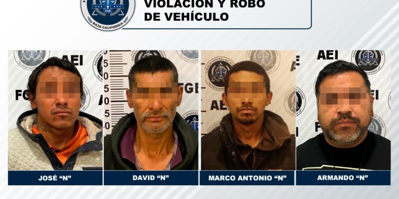 TIJUANA, BC, 23 DE ABRIL DE 2023.- Trabajo de gabinete y campo desarrollado por elementos de la Fiscalía General del Estado (FGE), permitió la aprehensión de cuatro hombres, que en casos por separado, deberán responder ante la justicia por los delitos de violación y robo de vehículo.