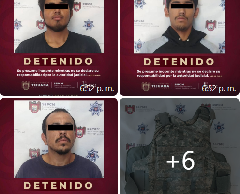 TIJUANA, BC, 12 DE SEPTIEMBRE DE 2023.- Tras recibir un reporte donde indicaban detonaciones de arma de fuego en Playas de Tijuana, y que los presuntos responsables huían por la avenida Internacional, se generó una fuerte movilización por la Policía Municipal la cual resultó en la detención de tres hombres.