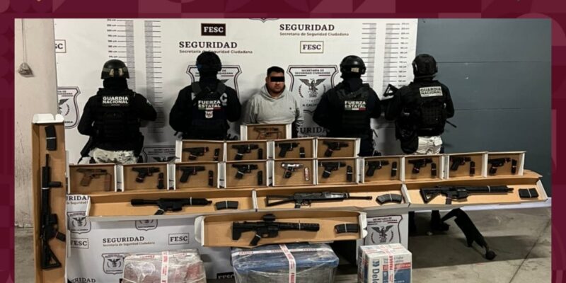 Todo lo anterior fue asegurado de forma inmediata, mientras el hombre quedó detenido y, con apoyo de la Guardia Nacional (GN), se le trasladó a la Fiscalía General de la República (FGR), autoridad responsable en determinar su situación jurídica por los delitos de Posesión de Armas de Fuego y Contra la Salud.