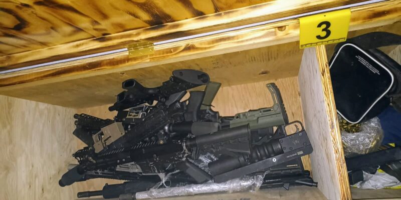 Por tal motivo, el MPF de la FGR en Baja California, solicitó una técnica de investigación ante el Juez y al desahogar dicha diligencia, la Policía Federal Ministerial (PFM), de la AIC, localizó 13 armas largas, un aditamento lanzagranadas, un tubo cañón, 16 cargadores de diversos calibres, 943 cartuchos útiles, 76 kilos de metanfetamina, tres kilos 600 gramos de heroína, un kilo de opio y un kilo de una sustancia blanca.