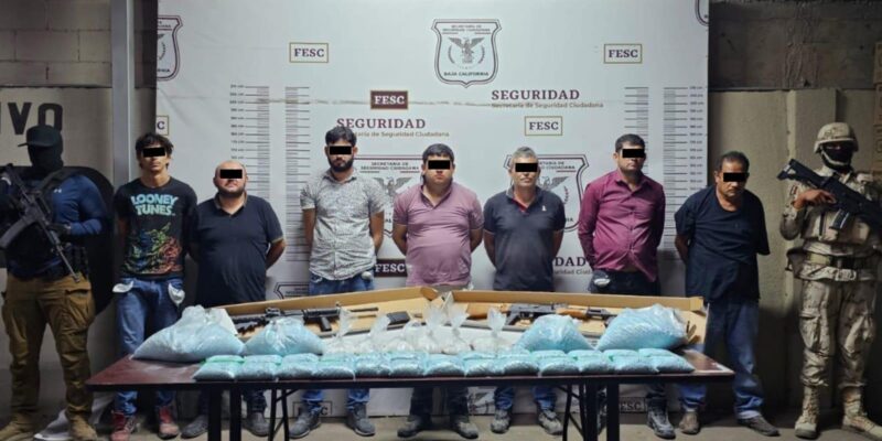 MEXICALI, BC, 11 DE OCTUBRE DE 2023.- Una denuncia ciudadana anónima a la línea 089 fue determinante para que agentes de la Fuerza Estatal de Seguridad Ciudadana (FESC) y personal de la Secretaría de la Defensa Nacional (SEDENA) lograran el aseguramiento de 35 kilos de fentanilo ilegal, 3 kilos de metanfetamina, armas y la detención de siete personas involucradas, además, del resguardo de una vivienda como parte de los trabajos de inteligencia e investigación.