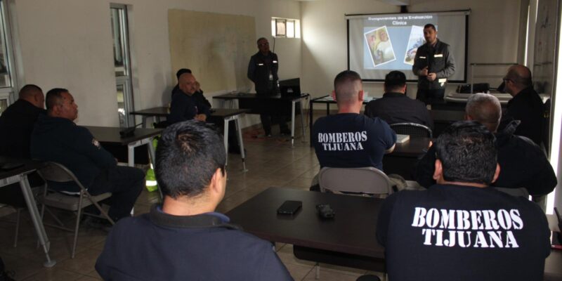 TIJUANA, BC, 27 DE FEBRERO DE 2024.- Las y los elementos de bomberos de este municipio reciben capacitación como primeros respondientes profesionales, por parte de personal del Centro Regulador de Urgencias Médicas (CRUM), con el taller “Evaluación del Paciente y Reporte al CRUM”, entre otros objetivos, para optimizar el uso de las ambulancias en casos realmente necesarios.