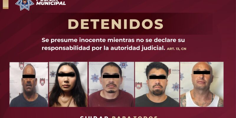 TIJUANA, BC, 13 DE SEPTIEMBRE DE 2023.- La Policía Municipal realizó la captura de varias personas en distintos hechos, por diversos delitos como robo con violencia, posesión de arma de fuego y una fugitiva de la ley.