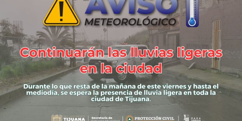 TIJUANA, BC, 20 DE SEPTIEMBRE DE 2024.- Lluvias ligeras continuarán presentándose en la ciudad de Tijuana durante la mañana de este viernes prolongándose hasta el mediodía; esto de acuerdo con información de la Dirección de Protección Civil del Ayuntamiento de Tijuana.