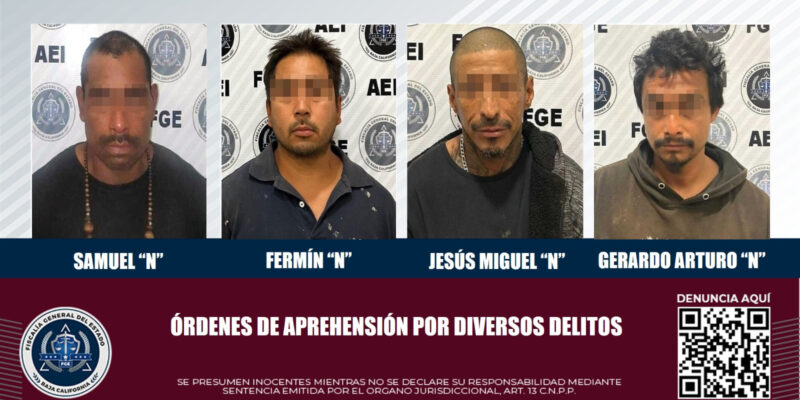 TIJUANA, BC, 07 DE SEPTIEMBRE DE 2023.- Agentes investigadores de la Fiscalía General del Estado (FGE), cumplimentaron cuatro mandamientos judiciales en hechos separados, en contra de sujetos que son investigados por diversos delitos.