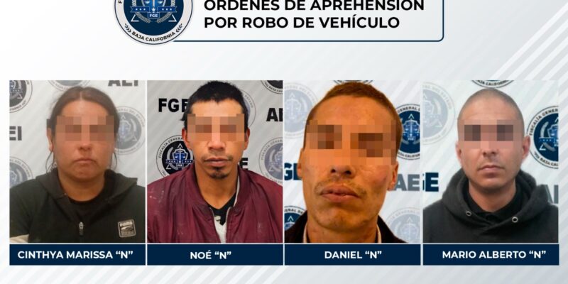 TIJUANA, BC, 01 DE MARZO DE 2023.- Mediante seguimiento e información recabada en gabinete y campo, la Agencia Estatal de Investigación (AEI) de la Fiscalía General del Estado, cumplimentó mandamientos judiciales en contra de tres hombres y una mujer, quienes, en casos por separado, están presuntamente señalados por el delito de robo de vehículo.