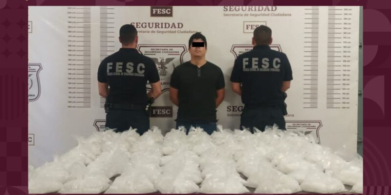 TIJUANA, BC, 30 DE AGOSTO DE 2023.- Un hombre detenido y el decomiso de más de 43 kilos del narcótico conocido como metanfetamina, son resultado de un trabajo de investigación por parte de agentes de la Fuerza Estatal de Seguridad Ciudadana (FESC), luego de dar atención a una denuncia anónima realizada en el número telefónico 089.