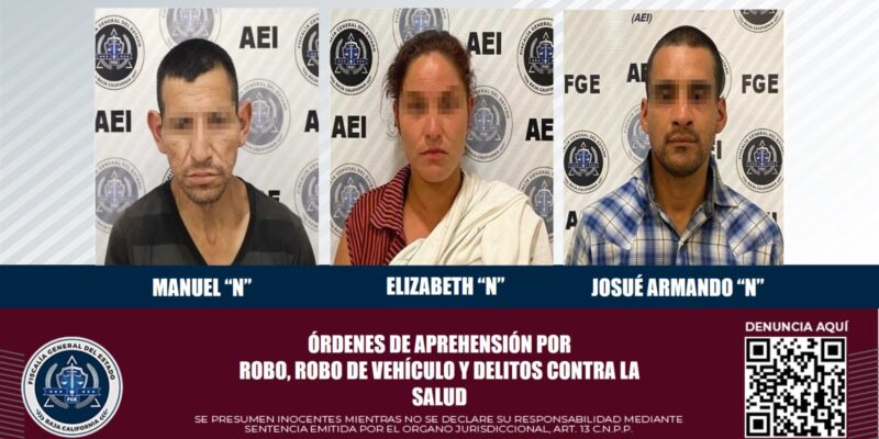 TIJUANA, BC, 30 DE AGOSTO DE 2023.- Como parte de las acciones de persecución del delito, la Fiscalía General del Estado, a través de su fuerza policial denominada Agencia Estatal de Investigación (AEI), logró la cumplimentación de órdenes de aprehensión por robo calificado, robo de vehículo y delitos contra la salud.