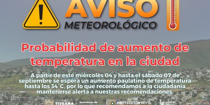 TIJUANA, BC, 03 DE SEPTIEMBRE DE 2024.- Un aumento paulatino de la temperatura ambiente se estima para la ciudad entre el miércoles 04 y el sábado 07 de septiembre, por lo que la Dirección de Protección Civil del XXIV Ayuntamiento de Tijuana exhortó a la ciudadanía a aplicar medidas para evitar afectaciones como insolación o deshidratación.