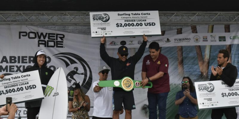 Morales, acompañado de Antonio Rodríguez Otañez, presidente de la Asociación Estatal de Surfing de Baja California, entregó los cheques de la bolsa prometida de 10 mil dólares a los ganadores de las tres modalidades, así como los cinturones verde y dorado que acreditaron el campeonato de cada campeón.