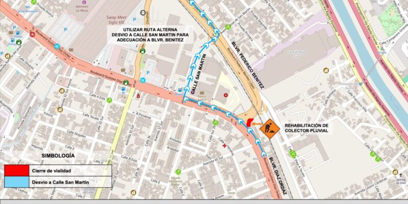 Por lo anterior, se requerirá el cierre temporal de la gaza de incorporación del Bulevar Díaz Ordaz a Bulevar Federico Benítez, por un lapso de 19 días, donde se habilitará una adecuación por Bulevar Díaz Ordaz hacia Calle San Martín, para incorporarse al Bulevar Federico Benítez.