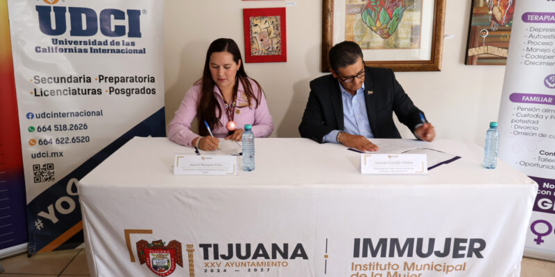 TIJUANA, BC, 26 JUNIO DE 2025.- Con el objetivo de fortalecer la prevención de la violencia y fomentar la formación socialmente responsable, la Universidad de las Californias Internacional (UDCI) y el Instituto Municipal de la Mujer (Inmmujer) firmaron un convenio de colaboración que beneficiará tanto a estudiantes como al personal de la dependencia.