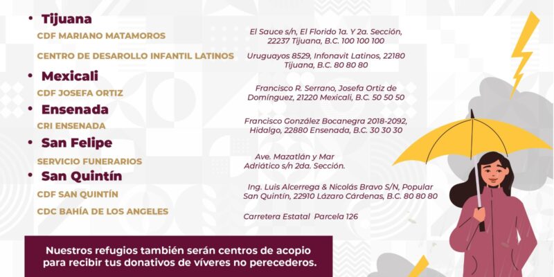 Mientras que en San Quintín el DIF Baja California tiene listo el CDF que se localiza en la calle Ing. Luis Alcerrega & Nicolás Bravo S/N, Popular San Quintín.