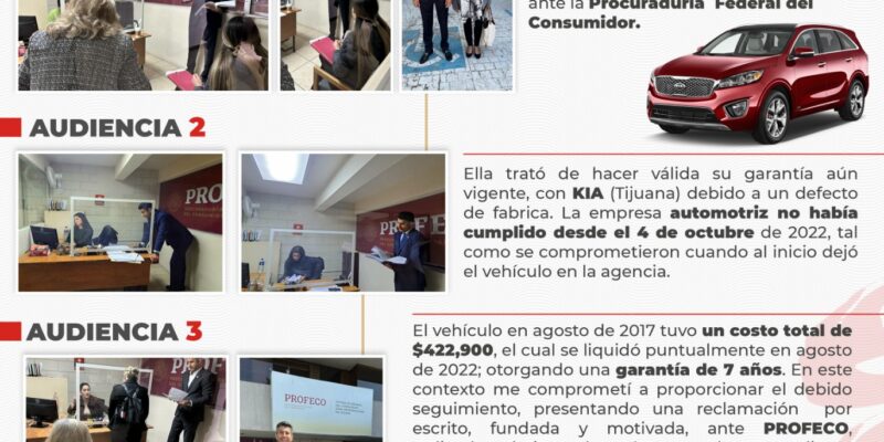 A finales del mes de febrero del presente año, la consumidora, Margarita Ramírez, se presentó en el módulo de gestión social y atención ciudadana del Diputado Sergio Moctezuma, ubicado en la ciudad de Tijuana, para manifestar que después de tratar de hacer válida su garantía aún vigente, con la empresa KIA (Tijuana) debido a una falla de fábrica del motor de su vehículo KIA SORENTO 2018, la empresa automotriz no le había cumplido con la restitución del motor por uno nuevo desde el 4 de octubre de 2022, tal como se lo expresaron y se comprometieron cuando al inicio dejó el vehículo en la agencia; quebrantando así la Ley Federal de Protección al Consumidor y la Norma Oficial Mexicana que regula la comercialización de vehículos de motor nuevos.