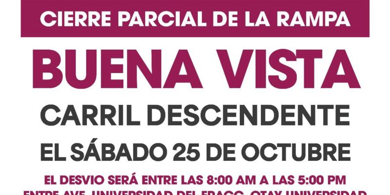 Tijuana, Baja California, 25 de octubre de 2025. El gobierno del presidente municipal, Ismael Burgueño Ruiz, en apoyo a los trabajos realizados por la Comisión Estatal de Servicios Públicos de Tijuana (CESPT), informa que este sábado 25 de octubre, se llevará a cabo el cierre parcial de un tramo del carril descendente de la Rampa Buena Vista.