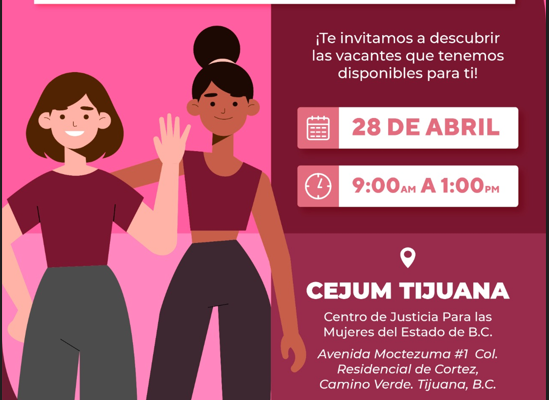 TIJUANA, BC, 19 DE ABRIL DE 223.- La Secretaría de Trabajo y Previsión Social (STPS), a través del Servicio Nacional del Empleo de Baja California (SNEBC), realizará una feria de empleo para la mujer, el próximo viernes 28 de abril en las instalaciones del Centro de Justicia para las Mujeres del Estado (CEJUM), en Tijuana.