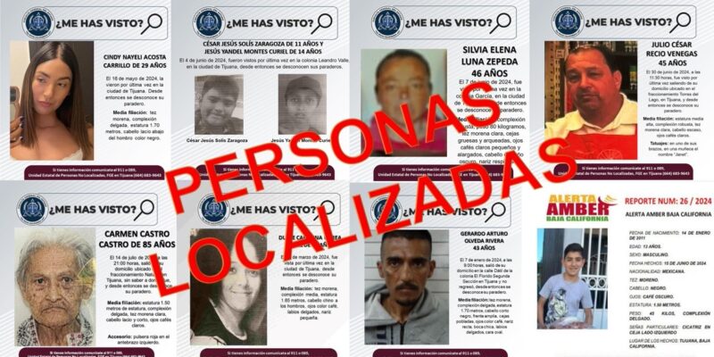 Las personas localizadas son: Cindy Nayeli Acosta Carrillo de 29 años, César Jesús Solís Zaragoza de 11 años, Jesús Yandel Montes Curiel de 14 años, Silvia Elena Luna Zepeda de 46 años, Julio César Recio Venegas de 45 años, Carmen Castro Castro de 85 años, Dulce Carolina Urrea Núñez de 32 años, Gerardo Arturo Olmeda Rivera de 43 años, y Derek Antonio Valencia Juárez de 13 años de edad, por quien se había emitido una Alerta Amber.