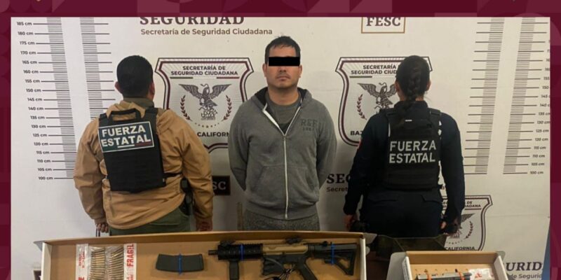 TIJUANA, BC, 03 DE FEBRERO DE 2023.- La oportuna participación de la ciudadanía, a través de la denuncia y el rápido actuar de la Fuerza Estatal de Seguridad Ciudadana (FESC) fueron fundamentales para la detención de un hombre que fue sorprendido en posesión de un arma de fuego larga, un arma de fuego corta y cargadores abastecidos de cartuchos útiles, en esta ciudad.