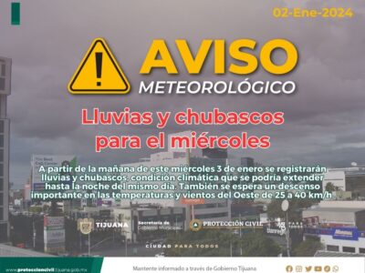 General Lluvias y chubascos para el miércoles 3 de enero TIJUANA, BC, 02 DE ENERO DE 2024.- Protección Civil Tijuana y la alcaldesa Montserrat Caballero recomiendan a la ciudadanía las siguientes medidas: -Proteger ... By ExpPubenero 2, 2024