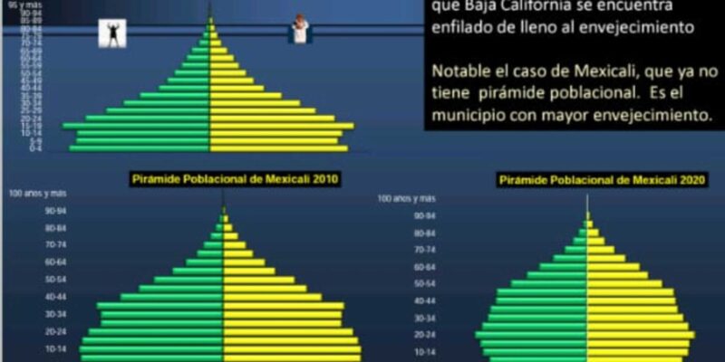En la última década —manifestó—, Baja California ha visto cómo se deforma su pirámide poblacional con la disminución de la tasa de natalidad y el envejecimiento de la población. Esto va a afectar la dinámica social, pues la estructura productiva tiende a una mayor proporción de población adulta laboralmente pasiva.