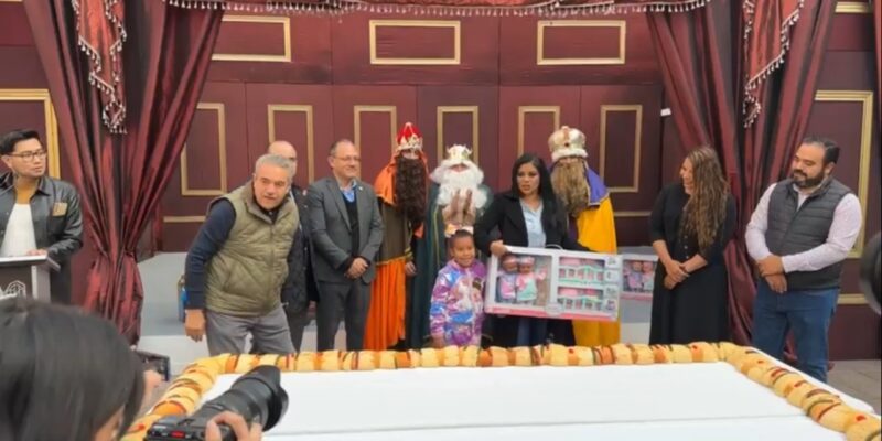 TIJUANA, BC, 06 DE ENERO DE 2023.- La alcaldesa Montserrat Caballero Ramírez acompañó a los Tres Reyes Magos a partir la Rosca de Reyes para iniciar la cabalgata de la entrega de juguetes a los niños que escribieron su carta y los que por alguna razón no pudieron enviarla en las delegaciones más vulnerables de Tijuana.