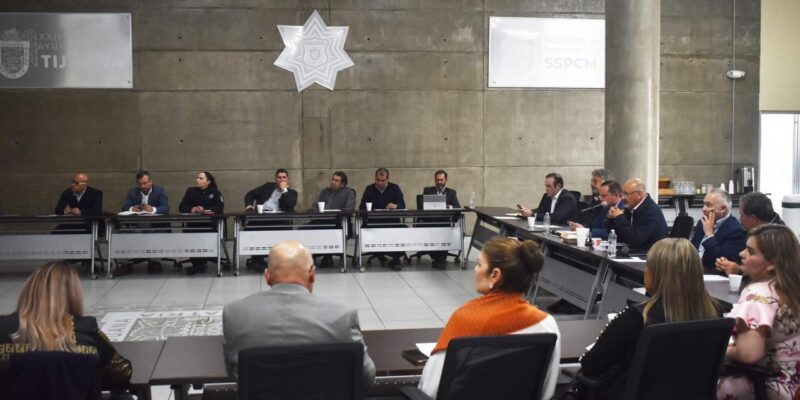 TIJUANA, BC, 23 DE MAYO DE 2023.- En la sala Compstat de la Secretaría de Seguridad y Protección Ciudadana Municipal (SSPCM) se llevó a cabo reunión de coordinación en materia de seguridad con el sector empresarial de Tijuana, la cual fue encabezada por el presidente del Consejo Coordinador Empresarial, Carlos Jaramillo Silva y el titular de la secretaría, José Fernando Sánchez González.