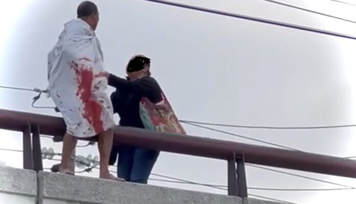En el video, primero se mira al hombre sentado en el tubo que sirve de protección en el puente y en algunos momentos se pone de pie como preparándose para lanzarse; luego aparece una mujer que camina en dirección a donde se encuentra el hombre y busca disuadirlo para que no se lanzara.