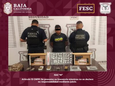 Detiene FESC en operativo a hombre con armas, cartuchos, droga y auto robado