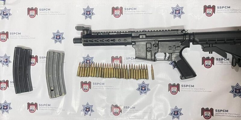 Posterior a la agresión y apoyo a los compañeros agredidos, grupos especiales de la corporación municipal lograron ubicar al detenido en el fraccionamiento Los Valles, en posesión de un fusil AR15, con dos cargadores de metal, uno de ellos abastecido con 30 cartuchos útiles y un chaleco balístico.