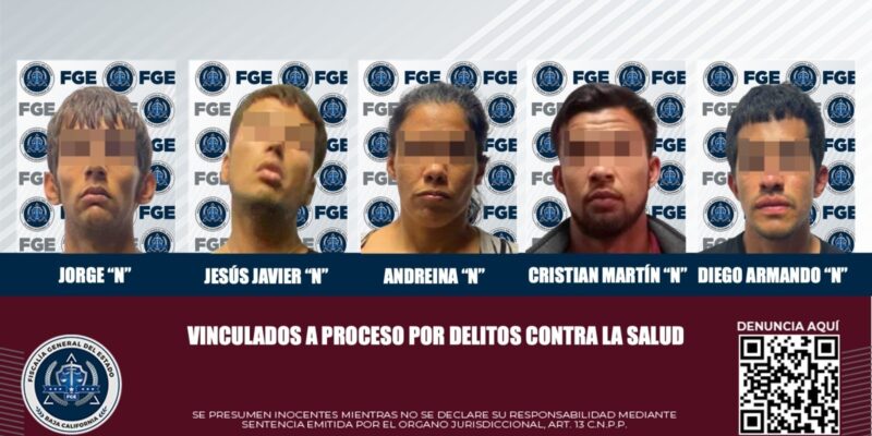TIJUANA, BC, 14 DE SEPTIEMBRE DE 2024.- La Fiscalía General del Estado informa que cinco imputados por delitos contra la salud en la modalidad de narcomenudeo fueron vinculados a proceso penal, luego de que el Ministerio Público presentará los elementos de prueba suficientes para que los jueces de control determinarán iniciar los procedimientos correspondientes.