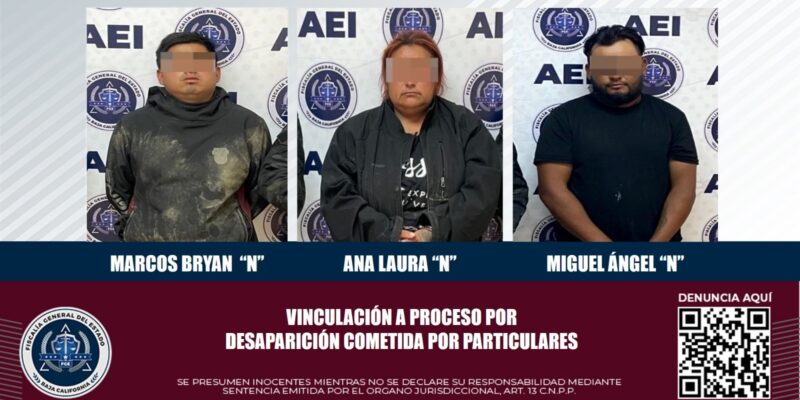 TIJUANA, BC, 29 DE JUNIO DE 2024.- Como resultado de acciones de investigación realizadas por la Fiscalía General del Estado, Marcos Bryan “N”, Ana Laura “N” y Miguel Ángel “N” fueron vinculados a proceso por su presunta participación en el delito de desaparición cometida por particulares en perjuicio de dos hombres.
